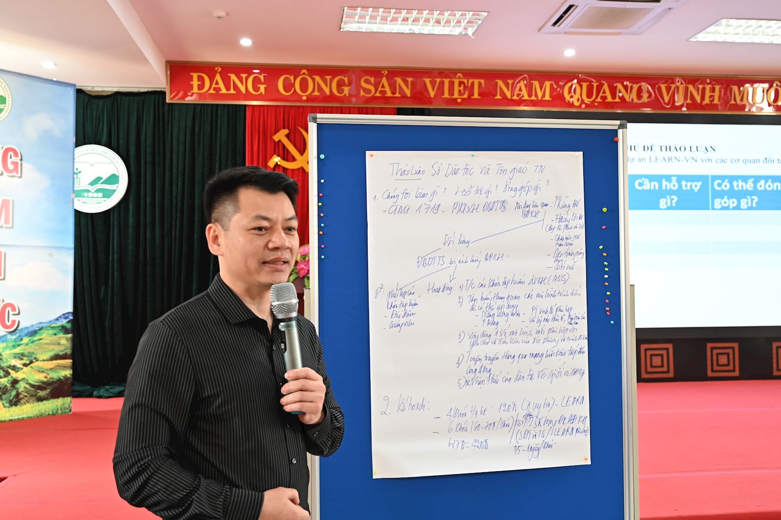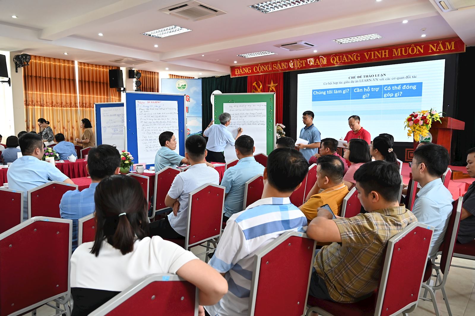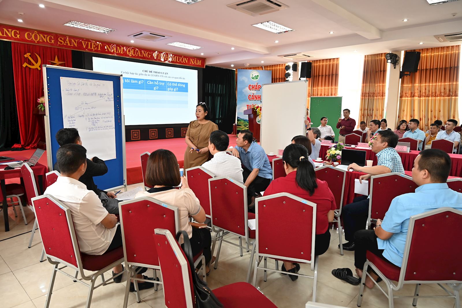 Phần thảo luận của hội thảo xoay quanh chủ đề: “Cơ hội hợp tác giữa Dự án LEARN-VN với các cơ quan đối tác”. Đại diện các sở, ngành và tổ chức đã tích cực trao đổi, đề xuất các cách thức lồng ghép hoạt động của dự án vào kế hoạch công tác thường niên của từng đơn vị, đồng thời xác định rõ vai trò và trách nhiệm của mình trong mạng lưới hợp tác. Cuộc thảo luận tập trung giải quyết ba câu hỏi chiến lược: “Chúng tôi đang làm gì?” – “Chúng tôi cần được hỗ trợ gì?” – “Chúng tôi có thể đóng góp gì?”, từ đó làm rõ định hướng phối hợp hiệu quả và lâu dài giữa các bên.