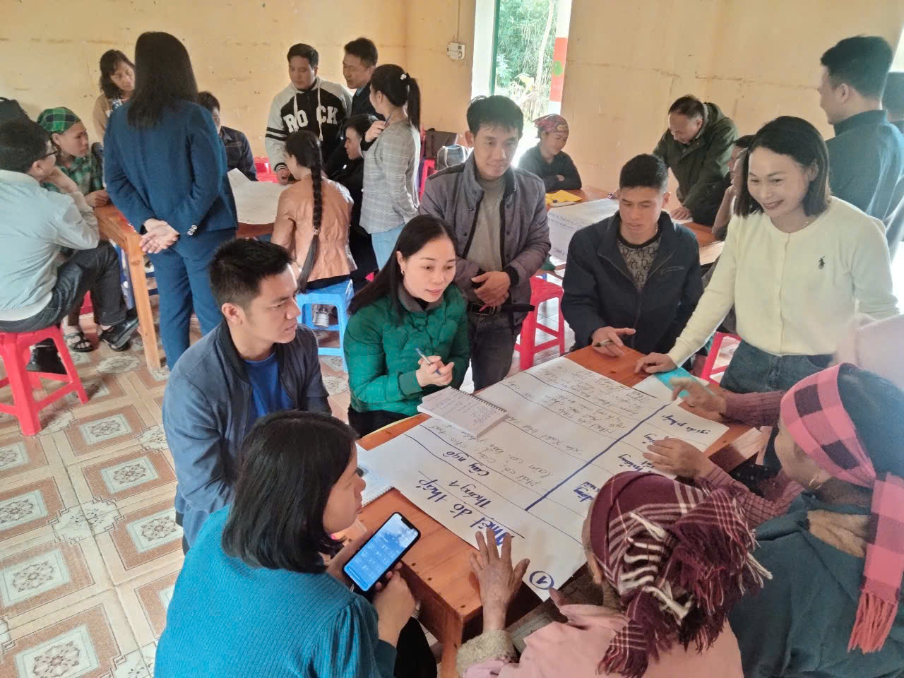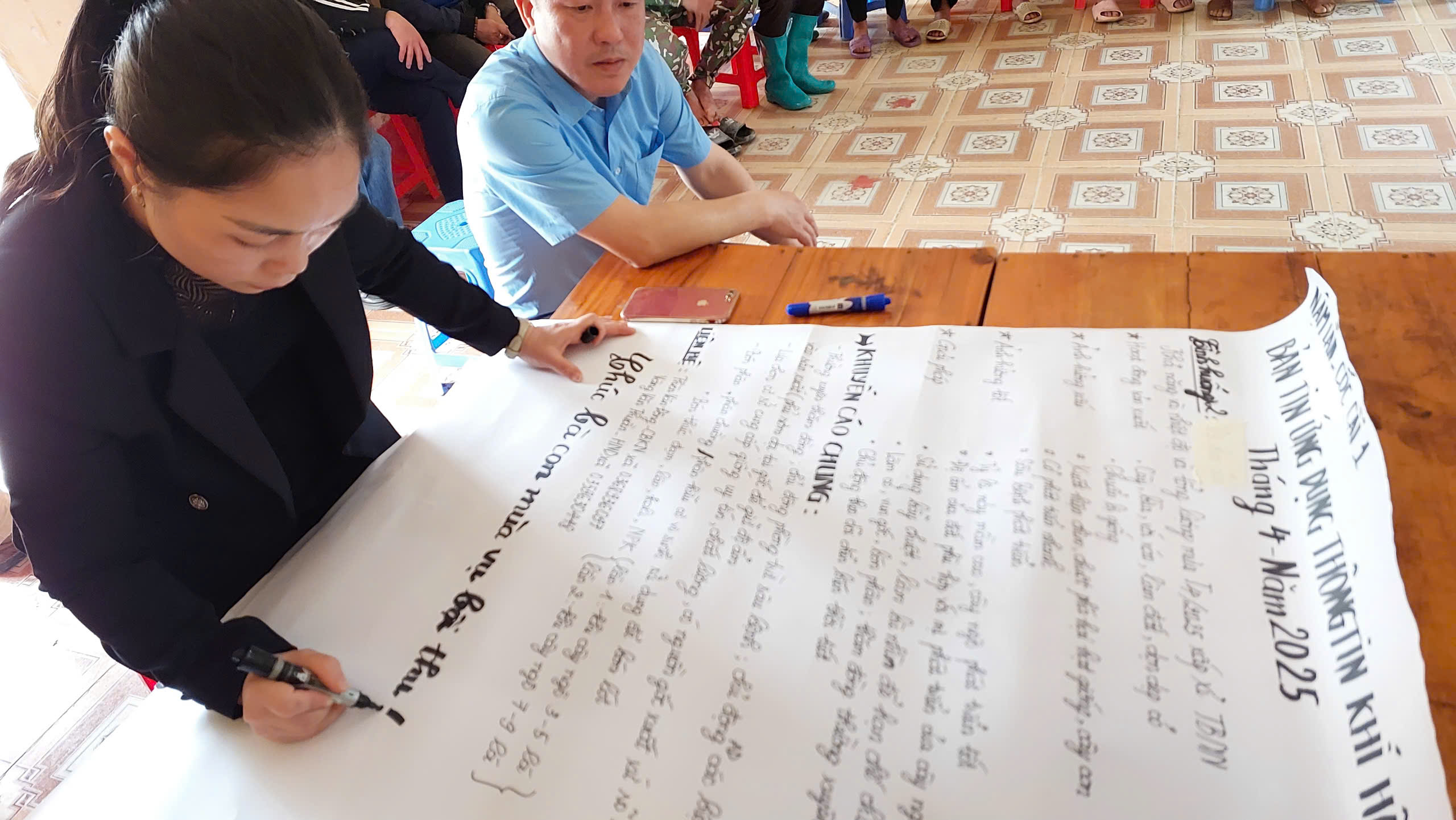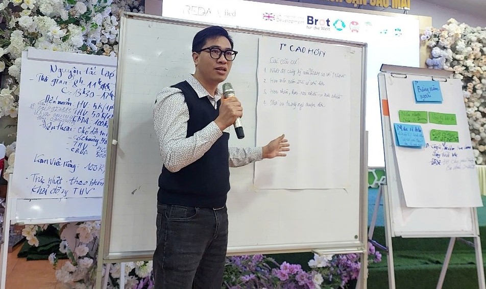 Sang ngày thứ hai, chương trình đi sâu vào việc hướng dẫn xây dựng bản tin khí hậu. Học viên được giới thiệu về các mẫu bản tin, cách xây dựng bản tin có sự tham gia và phương pháp tổng hợp, chỉnh sửa nội dung trước khi phát hành. Sau phần hướng dẫn, các nhóm thực hành xây dựng bản tin trong tổ kỹ thuật, trình bày kết quả và cùng nhau rút kinh nghiệm. Buổi chiều, các chuyên gia chia sẻ về kỹ năng phổ biến bản tin và cách lấy ý kiến phản hồi từ người dân, giúp học viên hiểu rõ hơn về quy trình truyền tải thông tin khí hậu một cách hiệu quả. Cuối ngày, học viên thực hành tổ chức phổ biến bản tin đến người dân và tiếp tục hoàn thiện kỹ năng này.